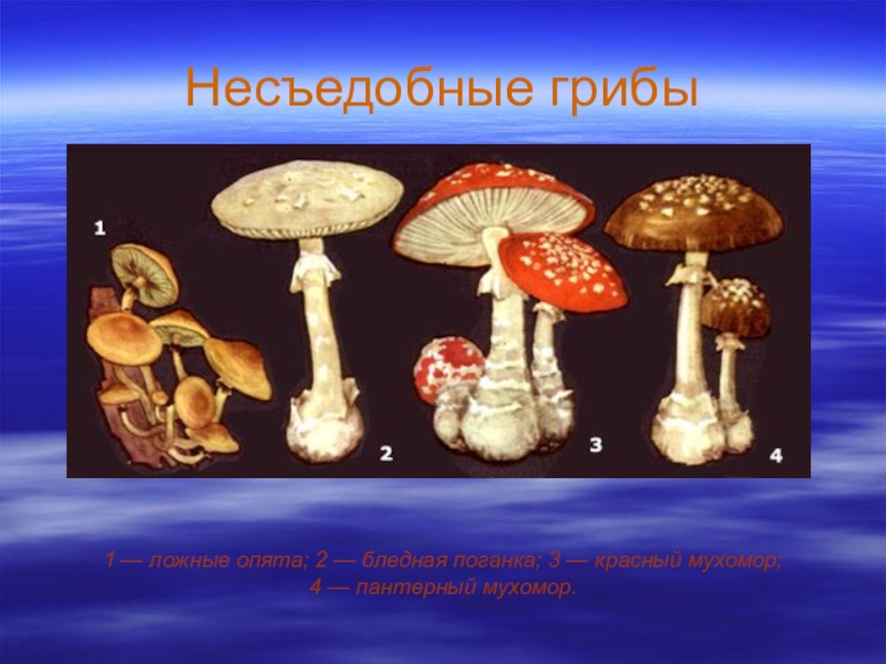 Несъедобные грибы1 — ложные опята; 2 — бледная поганка; 3 — красный мухомор;