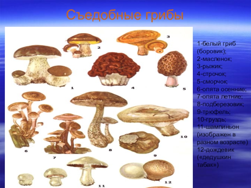 Съедобные грибы1-белый гриб (боровик); 2-масленок; 3-рыжик; 4-строчок; 5-сморчок; 6-опята осенние; 7-опята летние; 8-подберезовик; 9-трюфель; 10-груздь; 11-шампиньон (изображен