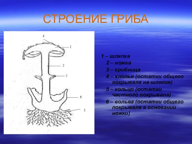СТРОЕНИЕ ГРИБА 1 – шляпка2 – ножка3 – грибница4 – хлопья (остатки общего покрывала на шляпке)5 – кольцо (остатки частного покрывала)6 – вольва (остатки общего покрывала в основании ножки)
