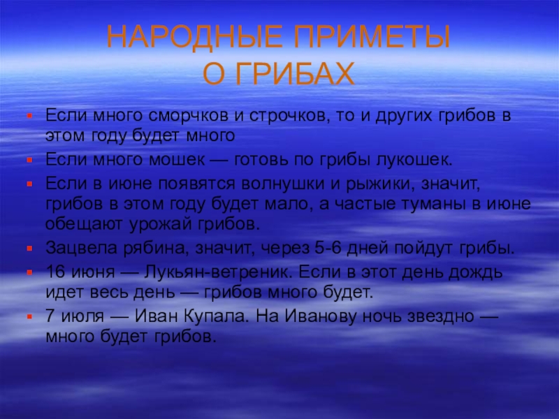 Слайд 9НАРОДНЫЕ ПРИМЕТЫ О ГРИБАХ