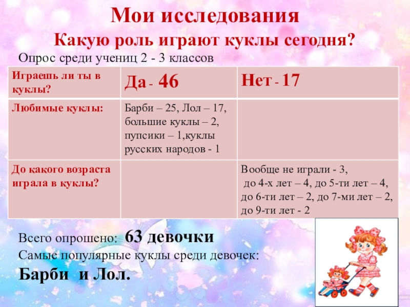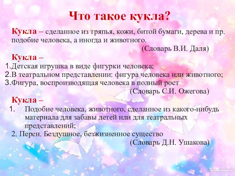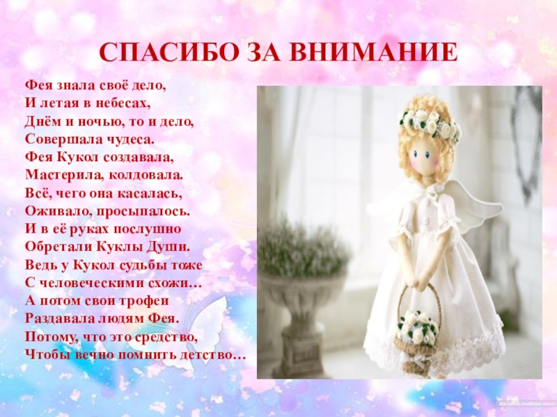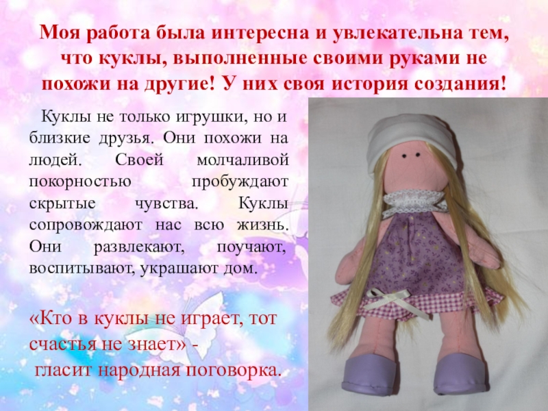 Куклы не только игрушки, но и близкие друзья. Они похожи на людей. Своей молчаливой покорностью пробуждают скрытые чувства. Куклы сопровождают нас всю жизнь. Они развлекают, поучают, воспитывают, украшают дом.
