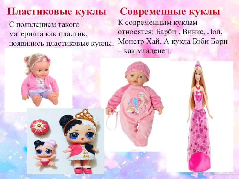 К современным куклам относятся: Барби , Винкс, Лол, Монстр Хай. А кукла Бэби Борн – как младенец.