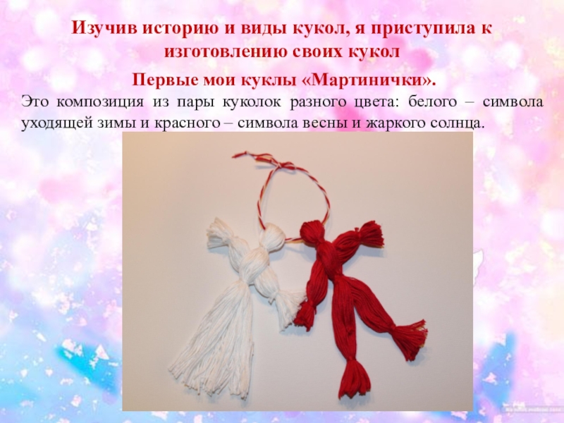 Это композиция из пары куколок разного цвета: белого – символа уходящей зимы и красного – символа весны и жаркого солнца.