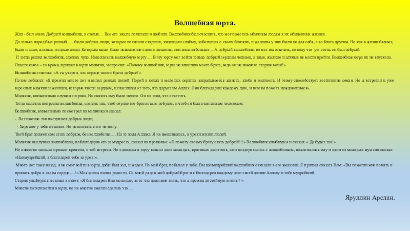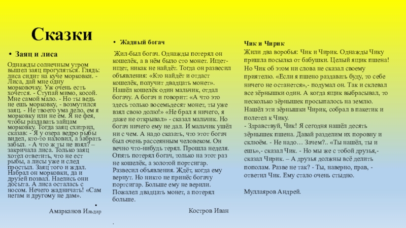 на куче морковки. - Лиса, дай мне одну морковочку. Уж очень есть хочется. - Ступай мимо, косой. Мне самой мало. - Но ты ведь не ешь морковку, - возмутился заяц. - Не твоего ума дело, ем я морковку или не ем. Я не фея, чтобы раздавать зайцам морковку. Тогда заяц схитрил, сказав: - Я у озера ведро рыбы видел, кто-то наловил, а забрать забыл. - А что ж ты не взял? – закричала лиса. Только заяц хотел ответить, что не ест рыбы, а лисы уже и след простыл. Заяц того и ждал. Набрал он морковки, да и друзей позвал. Наелись они досыта. А лиса осталась с носом. Нечего жадничать! «Сам негам и другому не дам».