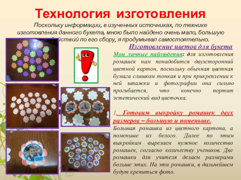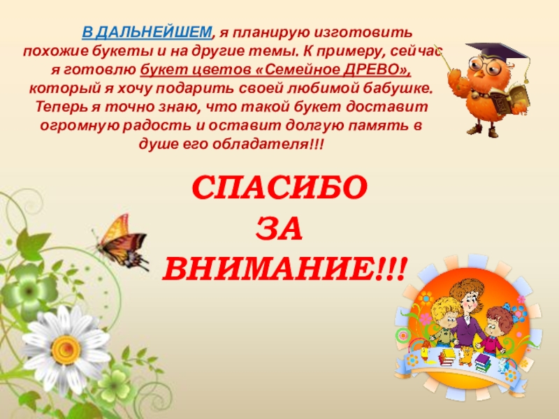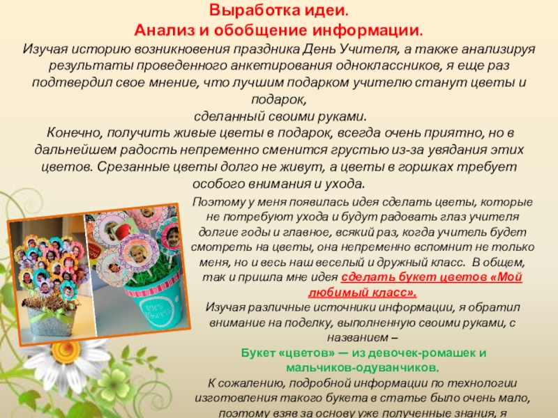Совместив главные критерии подарка – это цветы и подарок своими руками, я решил изготовить для учителя букет цветов, которому я дал название «Мой любимый класс».