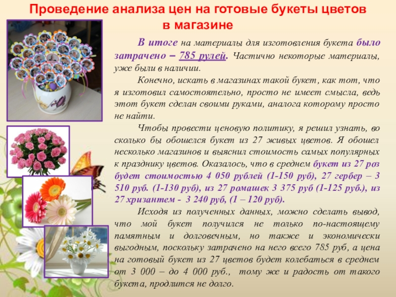 Исходя из полученных данных, можно сделать вывод, что мой букет получился не только по-настоящему памятным и долговечным, но также и экономически выгодным, поскольку затрачено на него всего 785 руб, а цена на готовый букет из 27 цветов будет колебаться в среднем от 3 000 – до 4 000 руб., тому же и радость от такого букета, продлится не долго.
