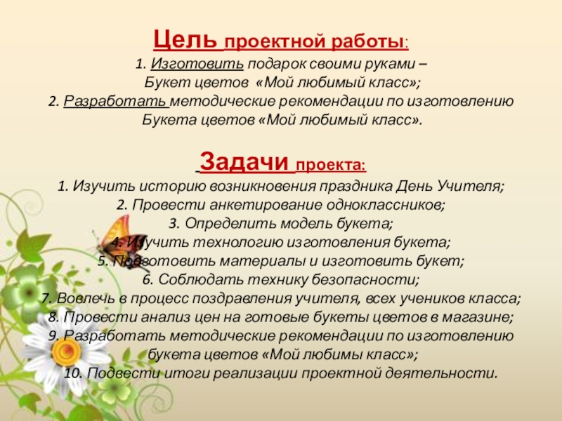 Кроме того, благодаря полученным результатам и навыкам, мною будут составлены методические рекомендации по изготовлению букета цветов «Мой любимы класс», которые окажутся очень полезными для учеников решивших изготовить такой подарок для своего дорогого учителя.