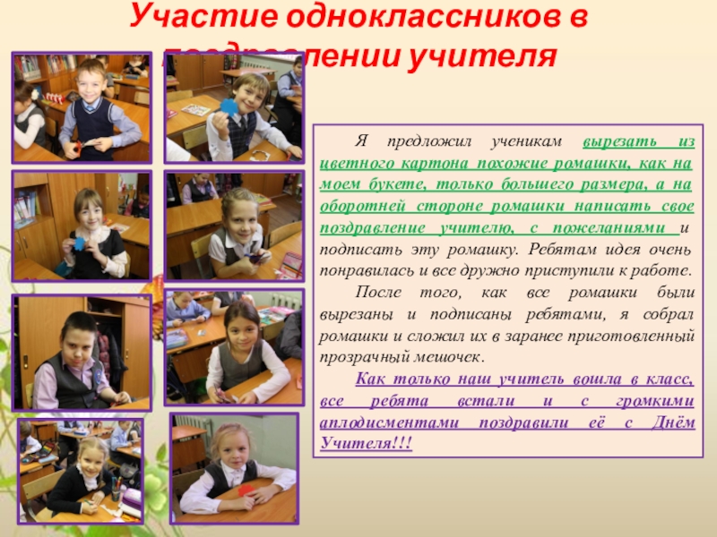 5. Вовлечение одноклассников в процесс поздравления учителя;