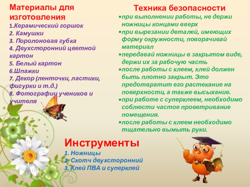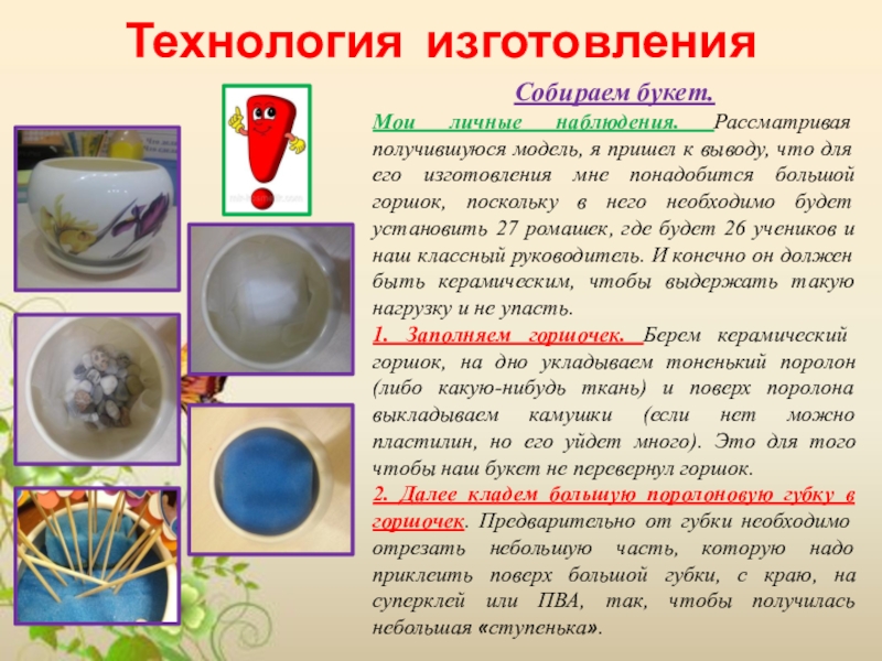 выводу, что для его изготовления мне понадобится большой горшок, поскольку в него необходимо будет установить 27 ромашек, где будет 26 учеников и наш классный руководитель. И конечно он должен быть керамическим, чтобы выдержать такую нагрузку и не упасть.