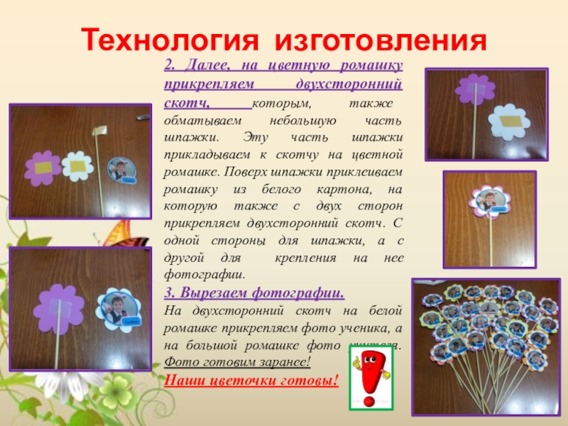 На двухсторонний скотч на белой ромашке прикрепляем фото ученика, а на большой ромашке фото учителя. Фото готовим заранее!