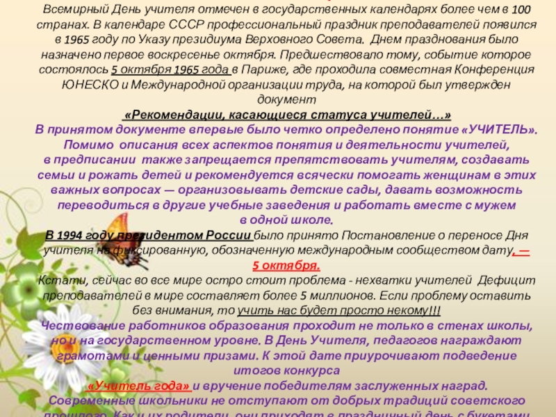 странах. В календаре СССР профессиональный праздник преподавателей появился в 1965 году по Указу президиума Верховного Совета. Днем празднования было назначено первое воскресенье октября. Предшествовало тому, событие которое состоялось 5 октября 1965 года в Париже, где проходила совместная Конференция ЮНЕСКО и Международной организации труда, на которой был утвержден документ