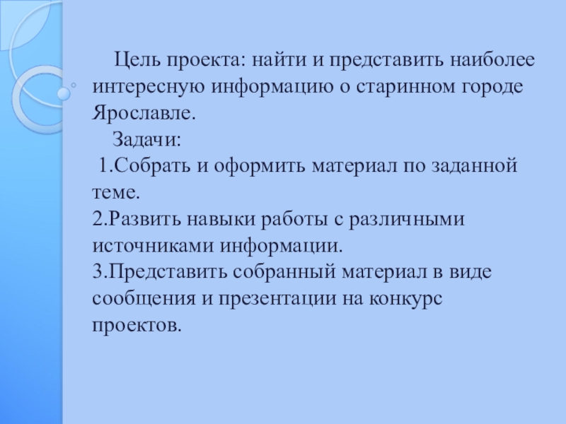 Цель проекта: найти и представить наиболее интересную информацию о старинном городе Ярославле. Задачи: 1.Собрать и оформить материал по заданной теме. 2.Развить навыки работы с различными источниками информации. 3.Представить собранный материал в виде