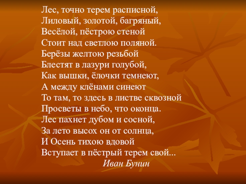 Лес, точно терем расписной,Лиловый, золотой, багряный,Весёлой, пёстрою стенойСтоит над светлою поляной.Берёзы желтою резьбойБлестят в лазури голубой,Как вышки,