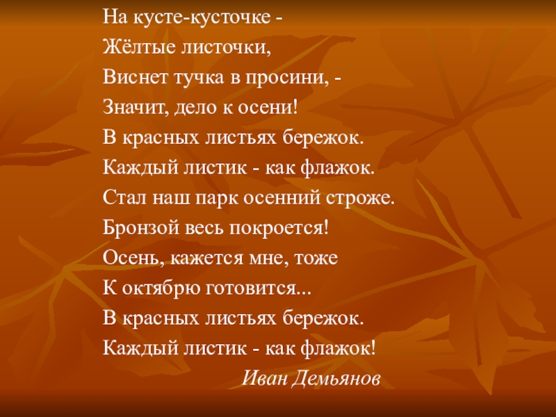 На кусте-кусточке - Жёлтые листочки,Виснет тучка в просини, - Значит, дело к осени!В красных листьях бережок.Каждый листик