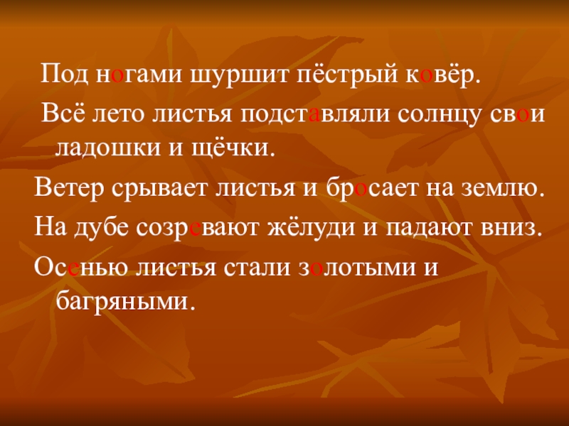 Под ногами шуршит пёстрый ковёр. Всё лето листья подставляли солнцу свои ладошки и щёчки.Ветер срывает листья