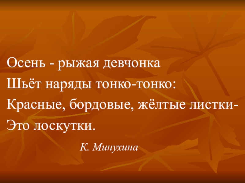 Осень - рыжая девчонкаШьёт наряды тонко-тонко:Красные, бордовые, жёлтые листки- Это лоскутки.						К. Минухина
