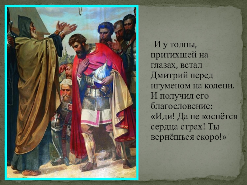 Слайд 15 И у толпы, притихшей на глазах, встал Дмитрий