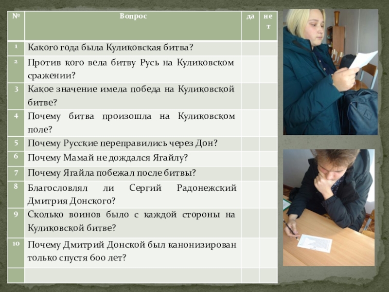 2. Обработка данных (определили исторические факты, провели опрос среди учащихся о знаниях Куликовской битвы);