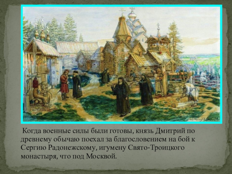 древнему обычаю поехал за благословением на бой к Сергию Радонежскому, игумену Свято-Троицкого монастыря, что под Москвой.