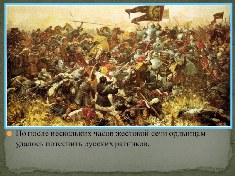 Слайд 23Но после нескольких часов жестокой сечи ордынцам удалось потеснить русских ратников.