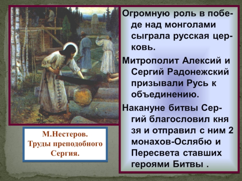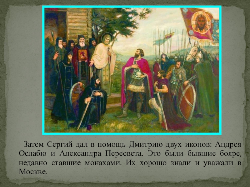 Затем Сергий дал в помощь Дмитрию двух иконов: Андрея Ослабю и Александра Пересвета. Это были