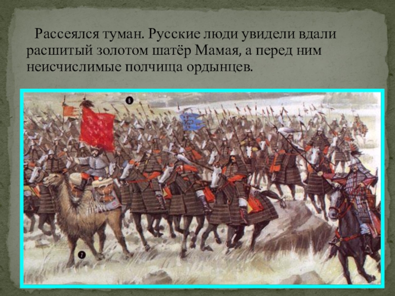 Рассеялся туман. Русские люди увидели вдали расшитый золотом шатёр Мамая, а перед ним неисчислимые