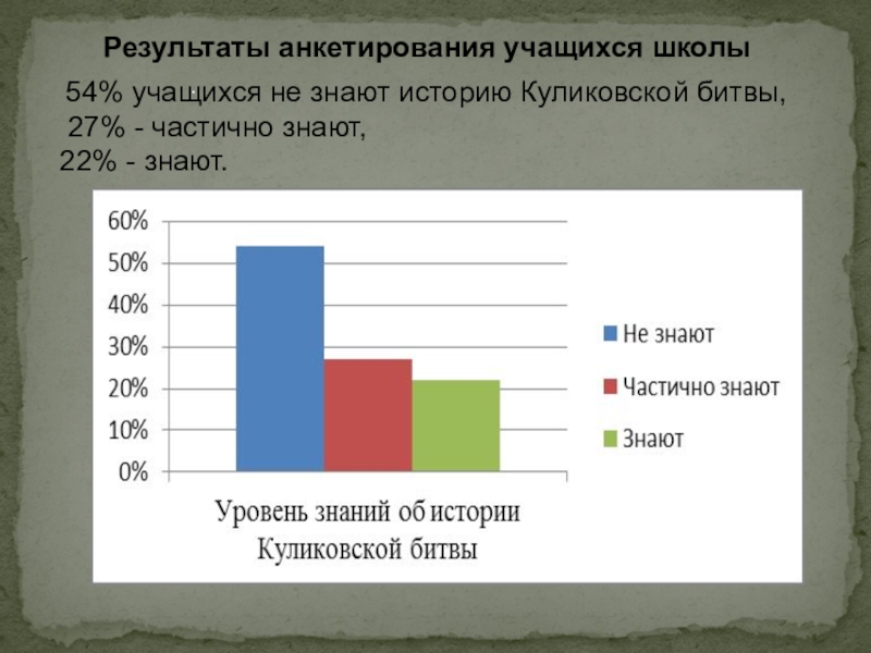 Результаты анкетирования учащихся школы. 54% учащихся не знают историю Куликовской битвы, 27% - частично знают,22% - знают.