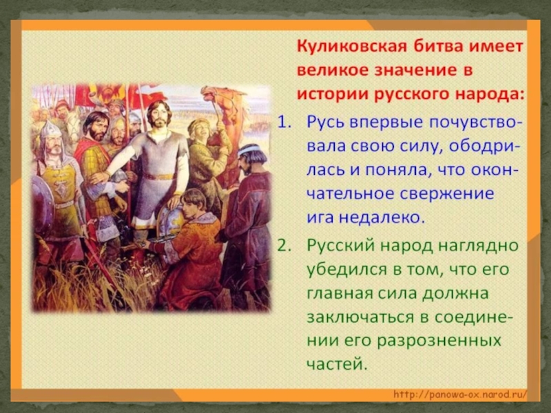 Эта победа была началом возрождения новой Руси. Сюда на поле Куликово пришли разрозненные