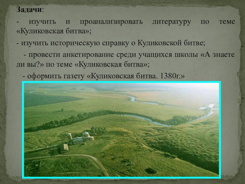 Задачи:- изучить и проанализировать литературу по теме «Куликовская битва»;- изучить историческую справку о Куликовской битве;  -