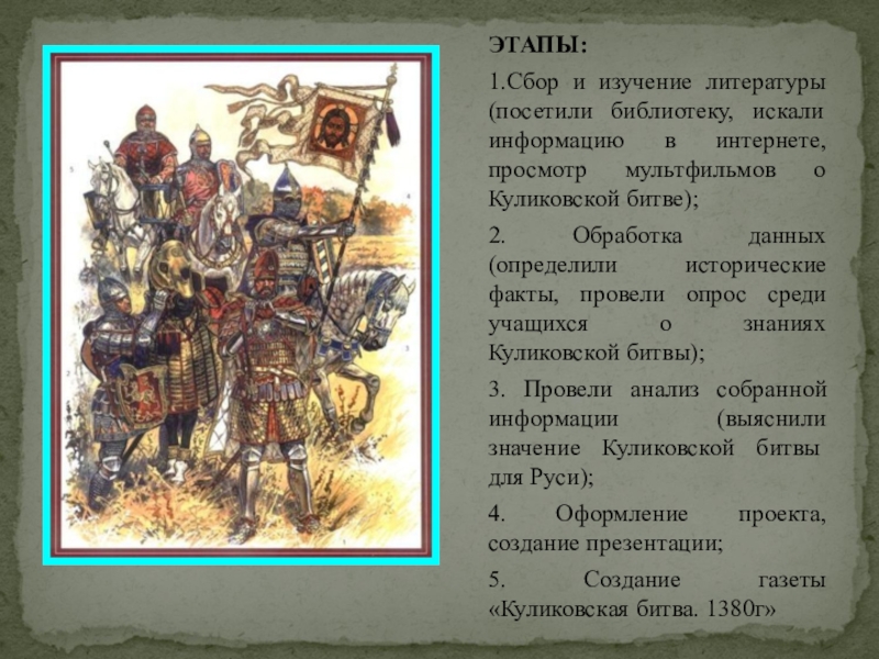 ЭТАПЫ:1.Сбор и изучение литературы (посетили библиотеку, искали информацию в интернете, просмотр мультфильмов о Куликовской битве);2. Обработка данных