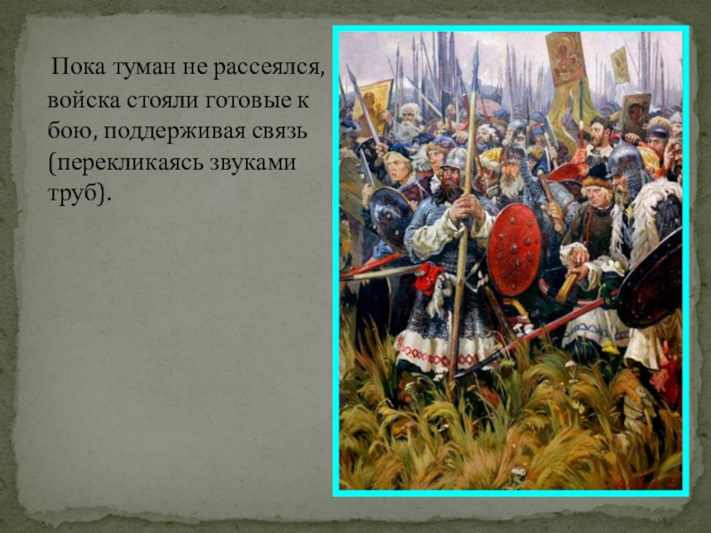 Слайд 19 Пока туман не рассеялся, войска стояли готовые к бою,