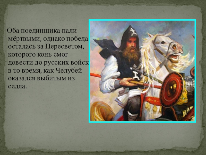 Слайд 22 Оба поединщика пали мёртвыми, однако победа осталась за Пересветом,