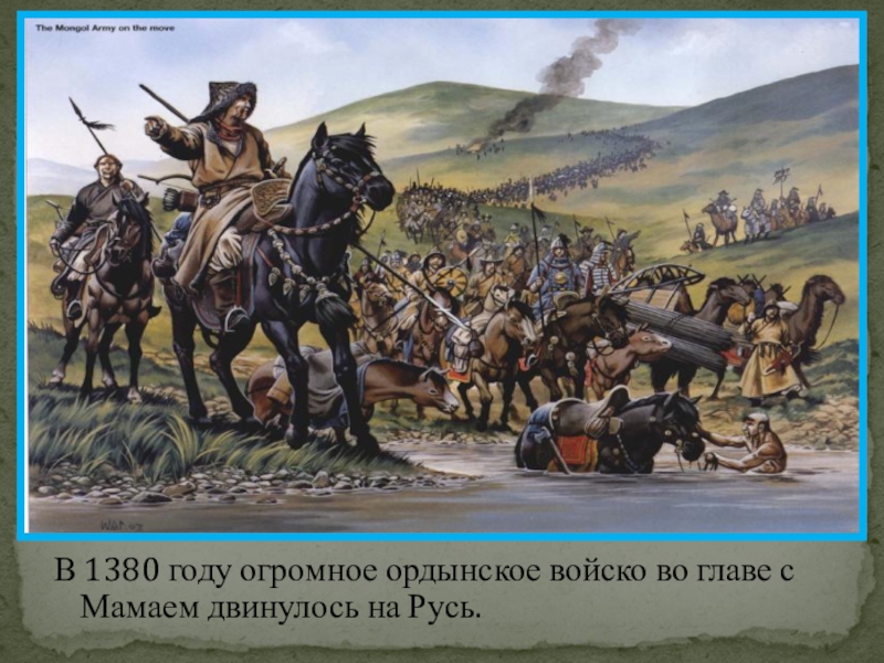 Слайд 12В 1380 году огромное ордынское войско во главе с Мамаем двинулось