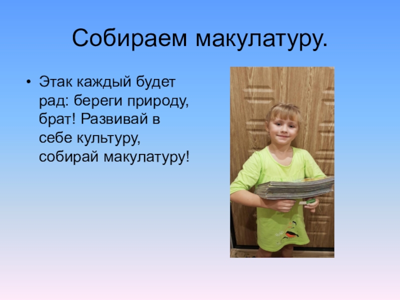 Собираем макулатуру.Этак каждый будет рад: береги природу, брат! Развивай в себе культуру, собирай макулатуру!