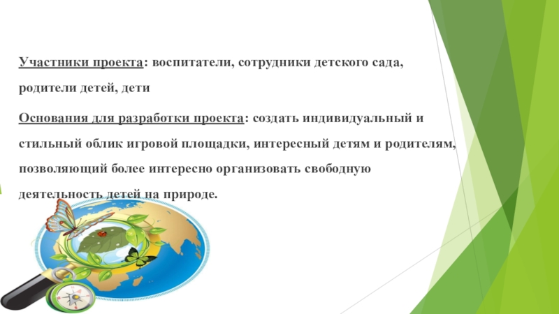 проекта: создать индивидуальный и стильный облик игровой площадки, интересный детям и родителям, позволяющий более интересно организовать свободную деятельность детей на природе.