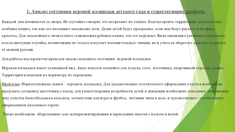 Слайд 71. Анализ состояния игровой площадки детского сада и существующих проблем.