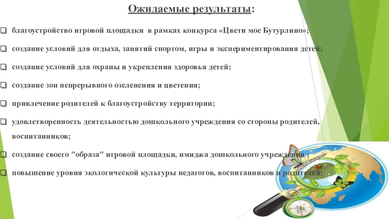 площадки, цветников, озеленение и оформление малыми архитектурными и игровыми формами площадки, создание безопасных условий для жизнедеятельности детей.