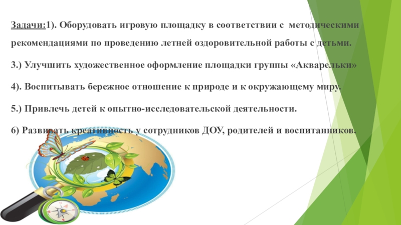 Слайд 5Задачи:1). Оборудовать игровую площадку в соответствии с методическими рекомендациями по проведению