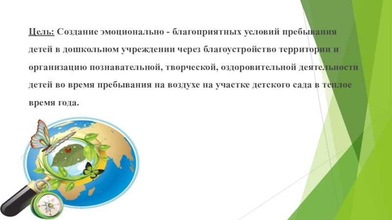 через благоустройство территории и организацию познавательной, творческой, оздоровительной деятельности детей во время пребывания на воздухе на участке детского сада в теплое время года.