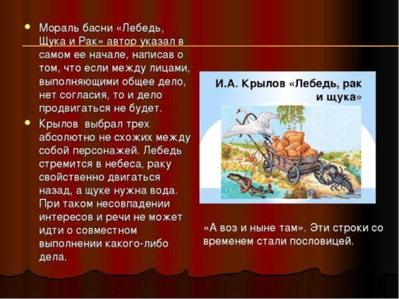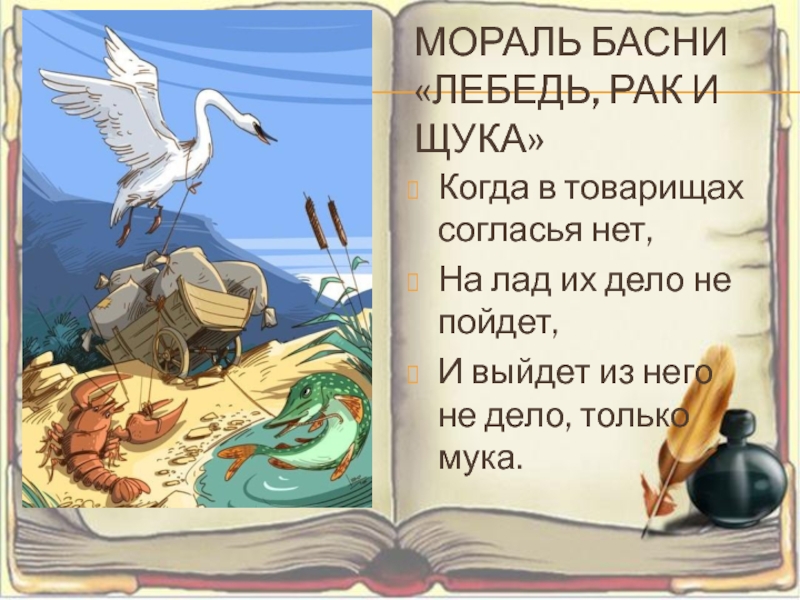 Слайд 21Мораль басни «лебедь, рак и щука»