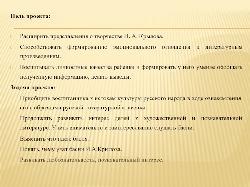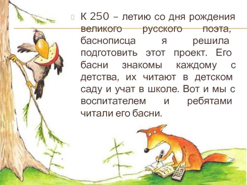 я решила подготовить этот проект. Его басни знакомы каждому с детства, их читают в детском саду и учат в школе. Вот и мы с воспитателем и ребятами читали его басни.