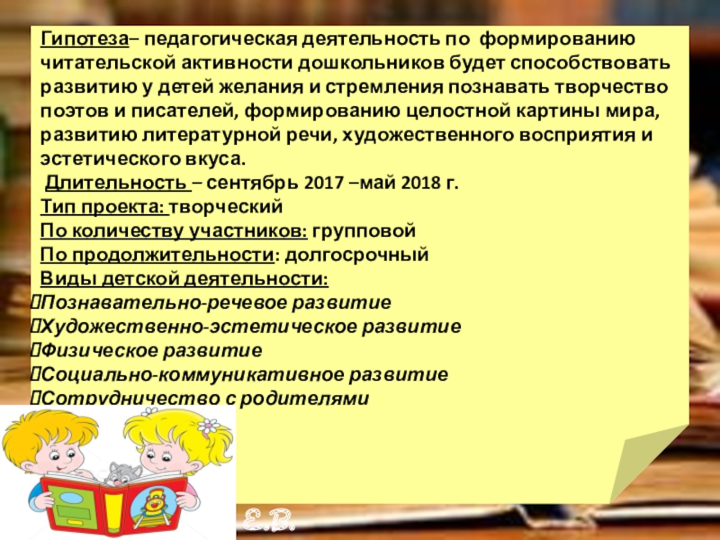 Слайд 5Гипотеза– педагогическая деятельность по формированию читательской активности дошкольников будет способствовать развитию