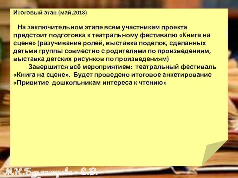 Завершится всё мероприятием: театральный фестиваль «Книга на сцене». Будет проведено итоговое анкетирование «Привитие дошкольникам интереса к чтению»