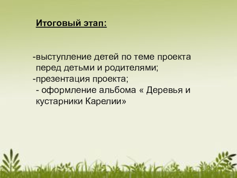 Итоговый этап:выступление детей по теме проекта перед детьми и родителями;презентация проекта;- оформление альбома « Деревья и кустарники