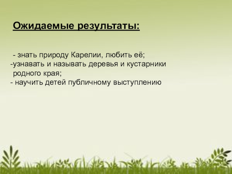 Ожидаемые результаты:- знать природу Карелии, любить её;узнавать и называть деревья и кустарники родного края; научить детей публичному