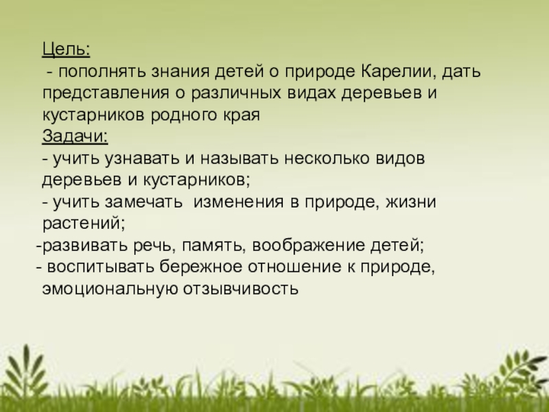 Цель: - пополнять знания детей о природе Карелии, дать представления о различных видах деревьев и кустарников родного