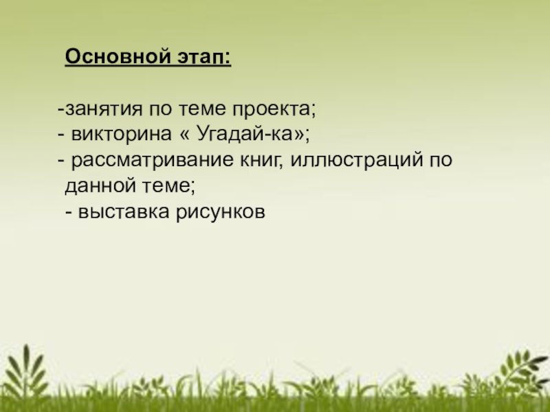 Основной этап: занятия по теме проекта; викторина « Угадай-ка»; рассматривание книг, иллюстраций по данной теме;- выставка рисунков
