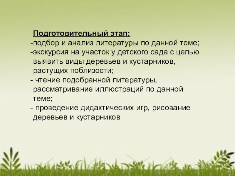 Подготовительный этап:подбор и анализ литературы по данной теме;экскурсия на участок у детского сада с целью выявить виды