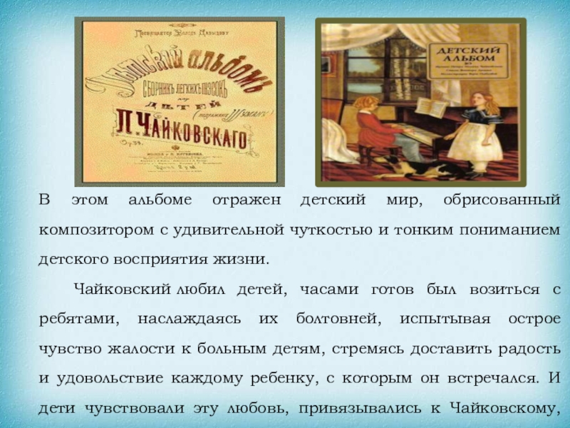 Чайковский любил детей, часами готов был возиться с ребятами, наслаждаясь их болтовней, испытывая острое чувство жалости к больным детям, стремясь доставить радость и удовольствие каждому ребенку, с которым он встречался. И дети чувствовали эту любовь, привязывались к Чайковскому, видя в нем нежного и заботливого друга.