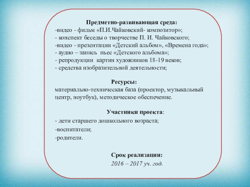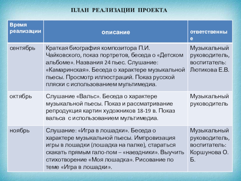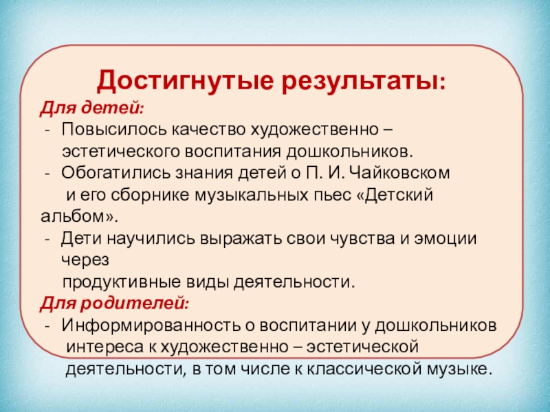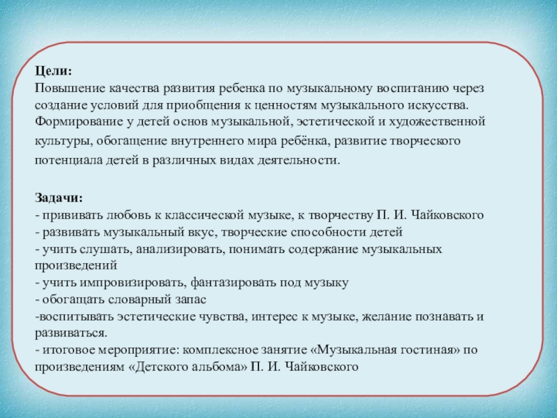 - итоговое мероприятие: комплексное занятие «Музыкальная гостиная» по произведениям «Детского альбома» П. И. Чайковского